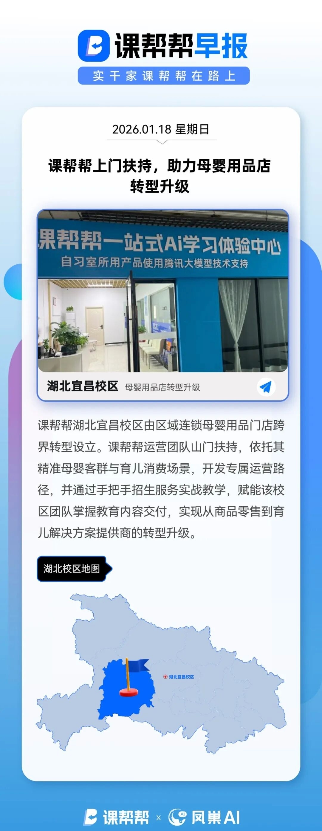 课帮帮湖北宜昌校区由区域连锁母婴用品门店跨界转型设立。课帮帮运营团队山门扶持,依托其精准母婴客群与育儿消费场景,开发专属运营路径,并通过手把手招生服务实战教学,赋能该校区团队掌握教育内容交付,实现从商品零售到育儿解决方案提供商的转型升级
