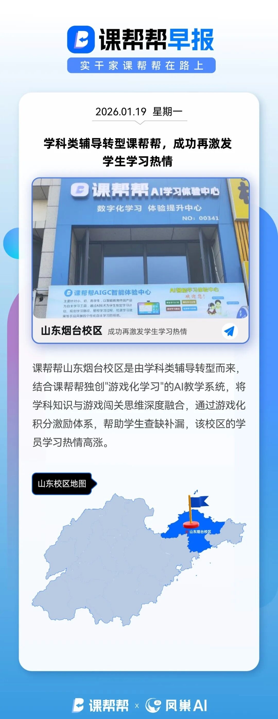 课帮帮山东烟台校区是由学科类辅导转型而来,结合课帮帮独创"游戏化学习"的AI教学系统,将学科知识与游戏闯关思维深度融合,通过游戏化积分激励体系,帮助学生查缺补漏,该校区的学员学习热情高涨。