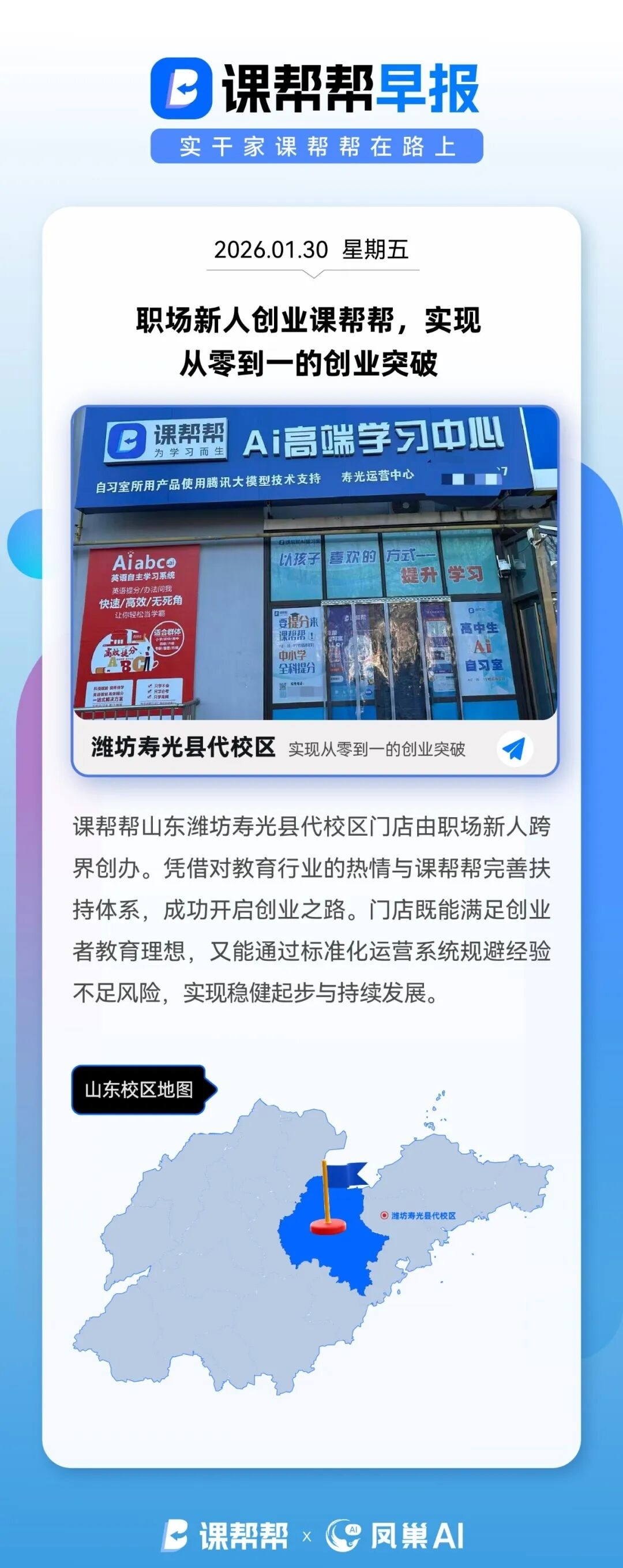 课帮帮山东潍坊寿光县代校区门店由职场新人跨界创办。凭借对教育行业的热情与课帮帮完善扶持体系,成功开启创业之路。门店既能满足创业者教育理想,又能通过标准化运营系统规避经验不足风险,实现稳健起步与持续发展。