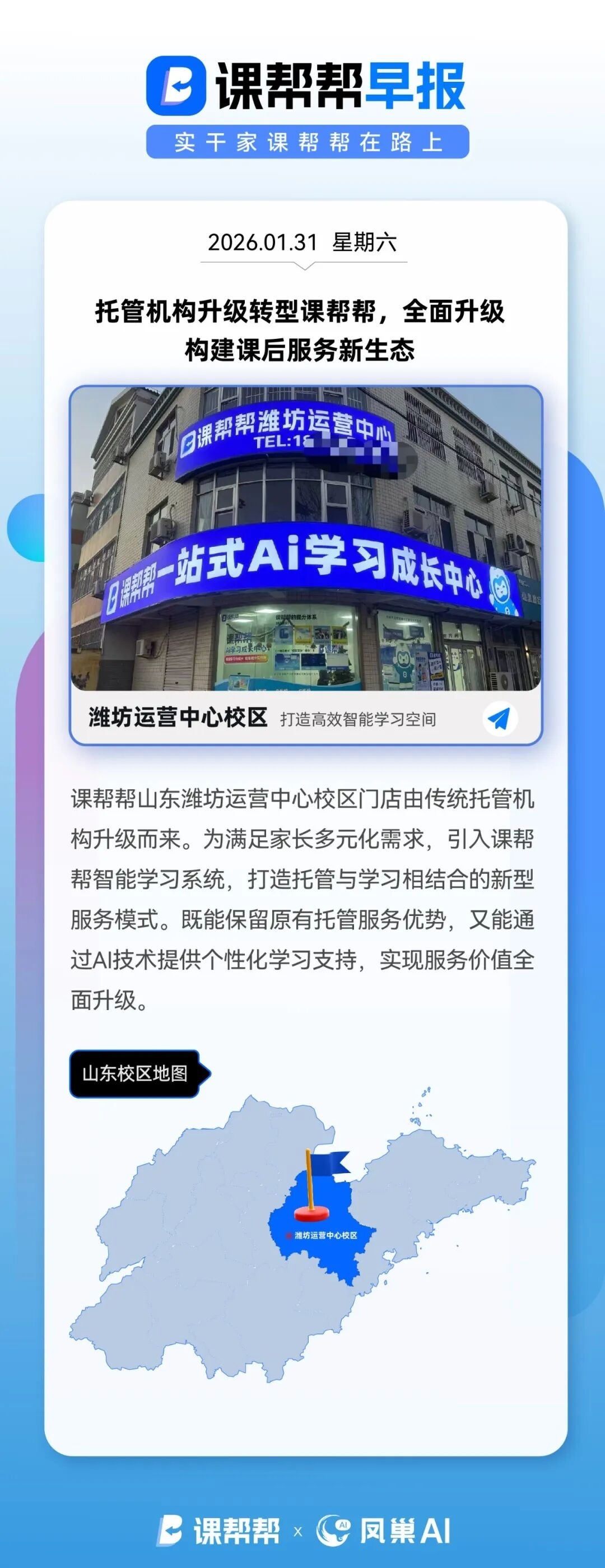 课帮帮山东潍坊运营中心校区门店由传统托管机构升级而来。为满足家长多元化需求,引入课帮帮智能学习系统,打造托管与学习相结合的新型服务模式。既能保留原有托管服务优势,又能通过AI技术提供个性化学习支持,实现服务价值全面升级。