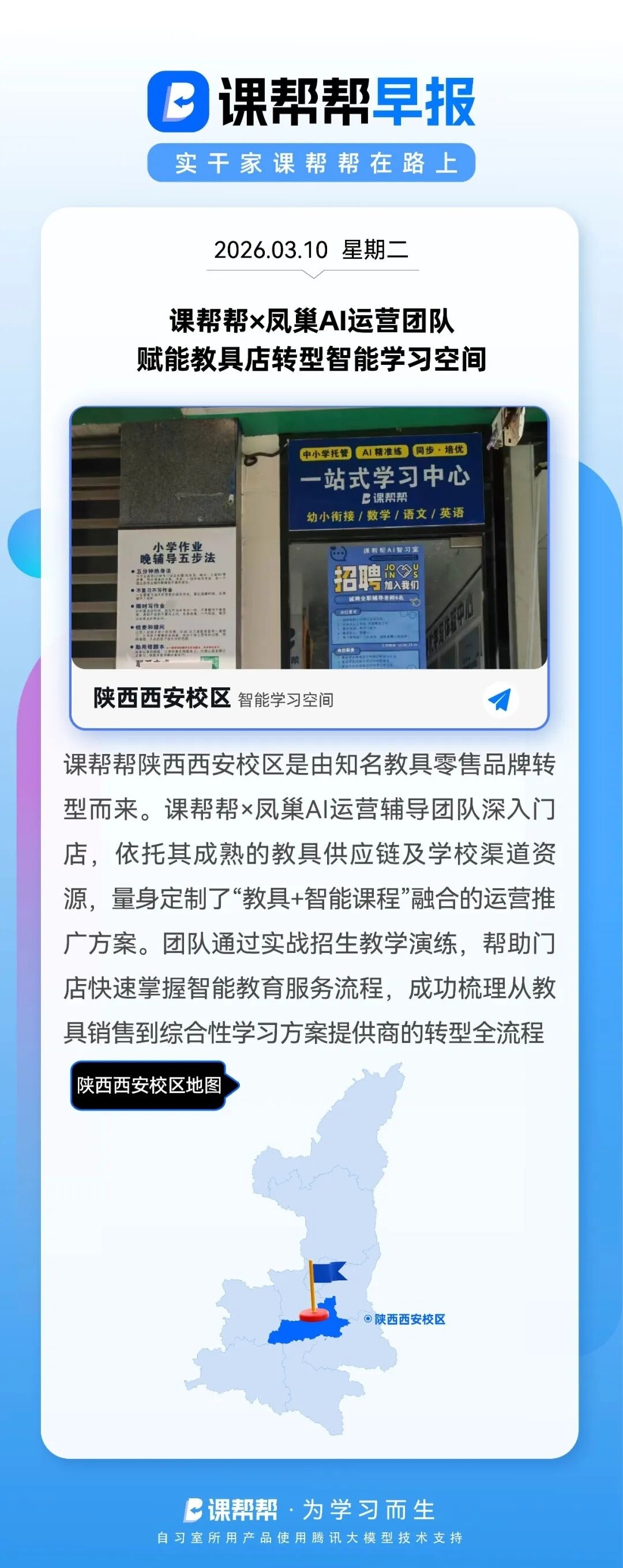 课帮帮陕西西安校区是由知名教具零售品牌转型而来。课帮帮x凤巢AI运营辅导团队深入门店,依托其成熟的教具供应链及学校渠道资源,量身定制了"教具+智能课程"融合的运营推广方案。团队通过实战招生教学演练,帮助门店快速掌握智能教育服务流程,成功梳理从教具销售到综合性学习方案提供商的转型全流程
