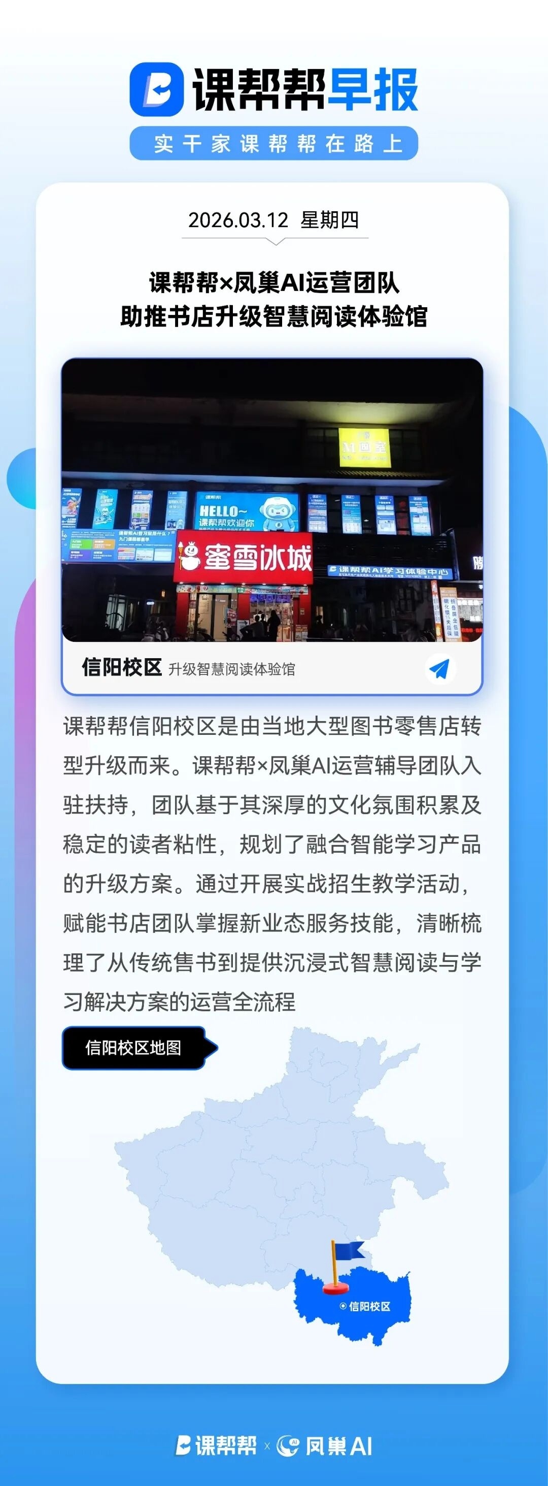 课帮帮信阳校区是由当地大型图书零售店转型升级而来。课帮帮x凤巢AI运营辅导团队入驻扶持,团队基于其深厚的文化氛围积累及稳定的读者粘性,规划了融合智能学习产品的升级方案。通过开展实战招生教学活动,赋能书店团队掌握新业态服务技能,清晰梳理了从传统售书到提供沉浸式智慧阅读与学习解决方案的运营全流程